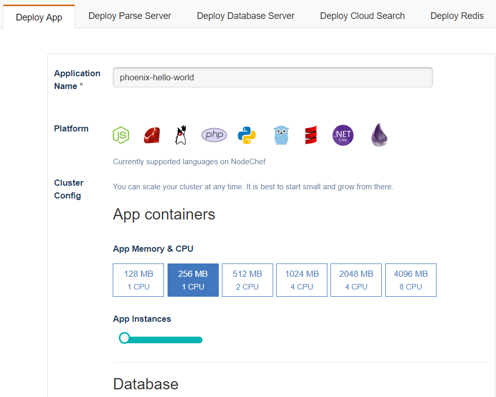 Create a NodeChef account and verify your account by clicking on the link emailed to you after you completed the sign up form. Log into your acount. On the dashboard, click on Deployments. You will be presented with the Deploy app form. Enter a name for your app, select the 256 or 512 RAM container size and then select the desired database. You can change the RAM capacity of your container at anytime. You can freely experiment with container sizes as NodeChef charges by the hour. Choose between the US-East or EU-West data center and then click on the Launch Cluster button.